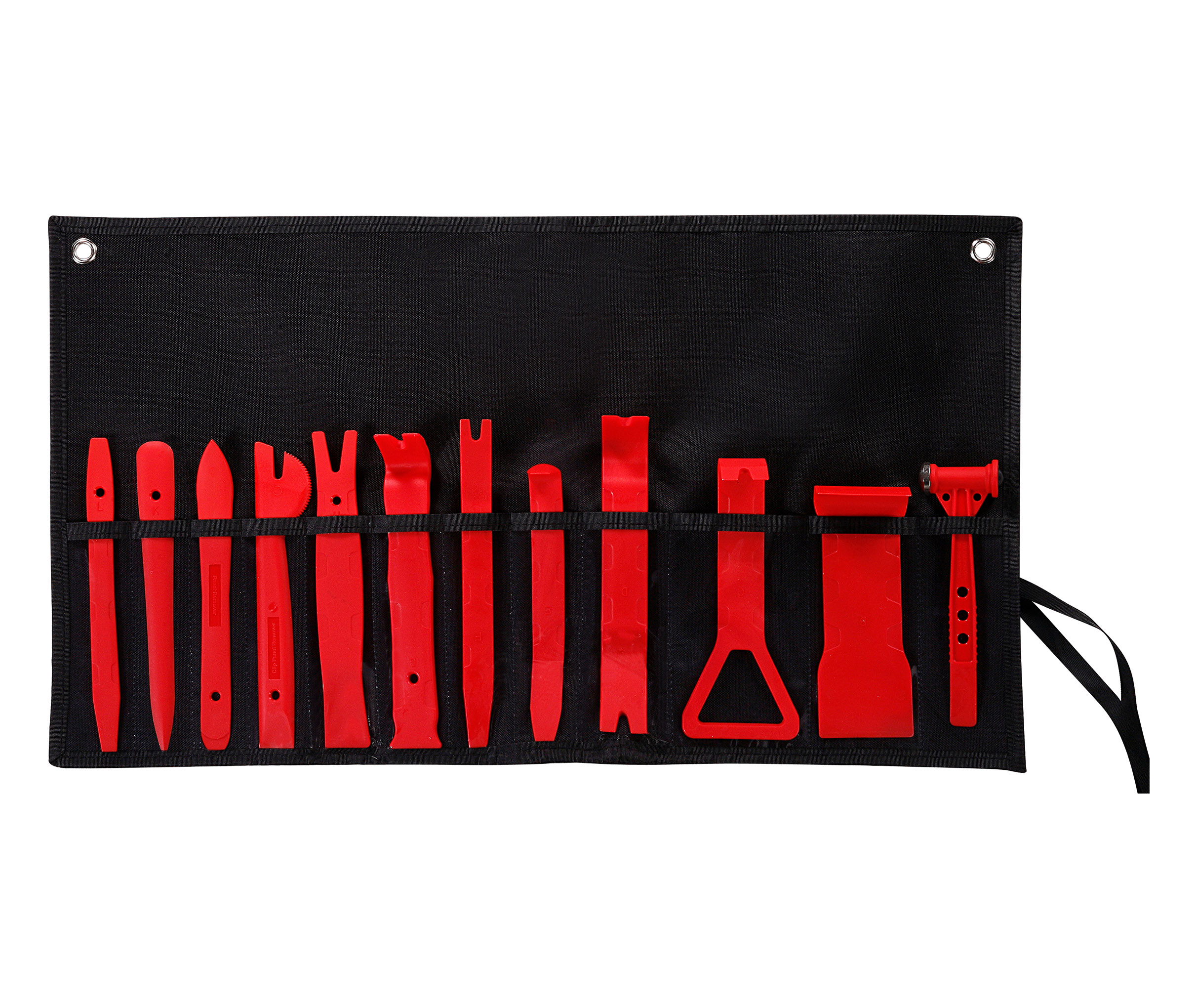 Juego profesional de 12 herramientas para desmontar de manera fácil y cómoda piezas del interior de automóvil, como: elementos del panel de controles, paneles de puertas, molduras, tapas decorativas, etc.