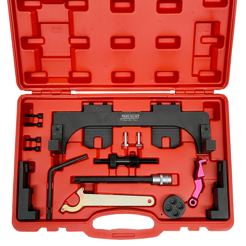 Este conjunto contiene las herramientas necesarias para mantener el motor en la posición correcta para reemplazar la cadena de distribución de los últimos motores gasolina BMW a partir de 2014.