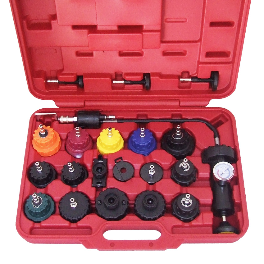 Permite comprobar los circuitos de refrigeración en la mayoría de los vehículos ya que consta de 19 adaptadores y una bomba de presión.